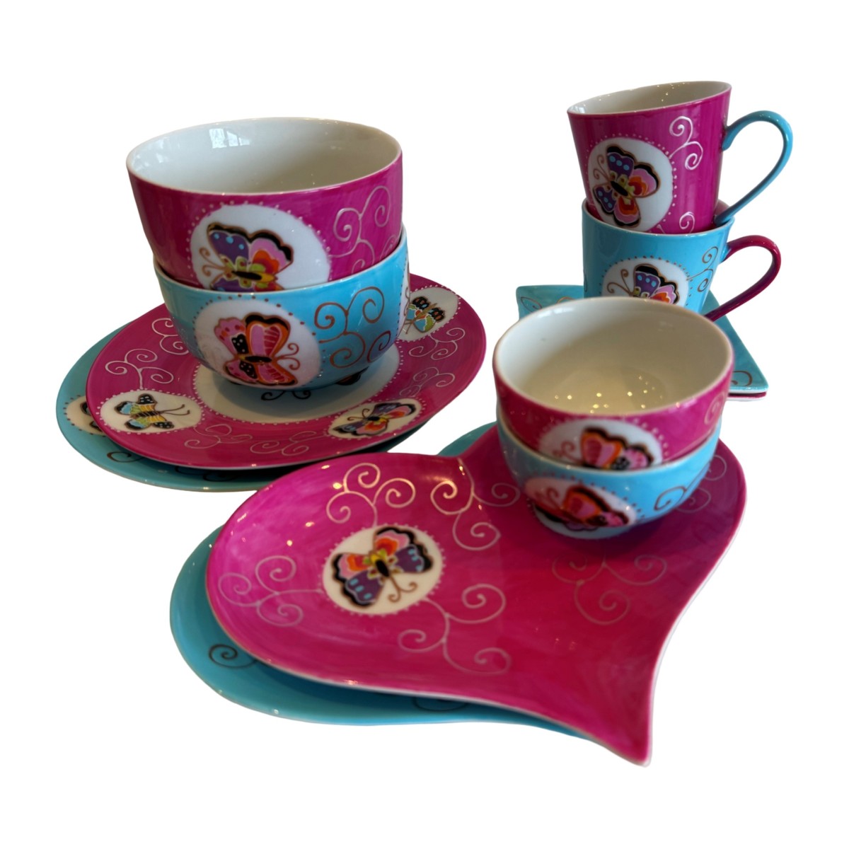 This colourful sophisticated porcelain children's dinnerware set, has a sea blue glaze and is richly decorated with butterflies. The gift box containing the crockery includes a plate, bowl, smaller bowl and mug. The ornate hand-painted butterfly illustration and patterns make it a cheerful set; Lovely for decoration or for use at a children's party. With this tableware on the table, your child will feel like a prince or princess just like in a fairy tale! Also available in fuchsia. Great as a gift!