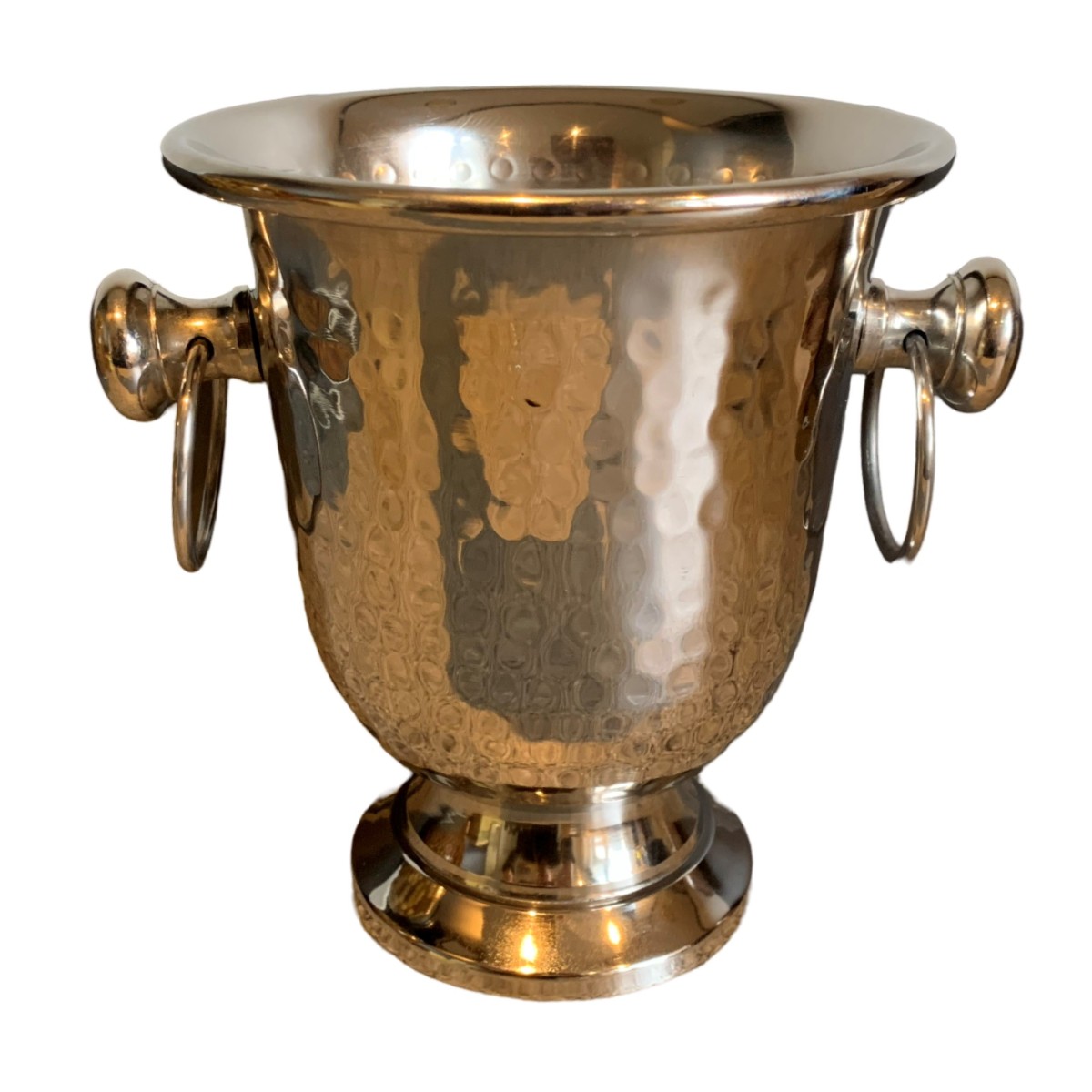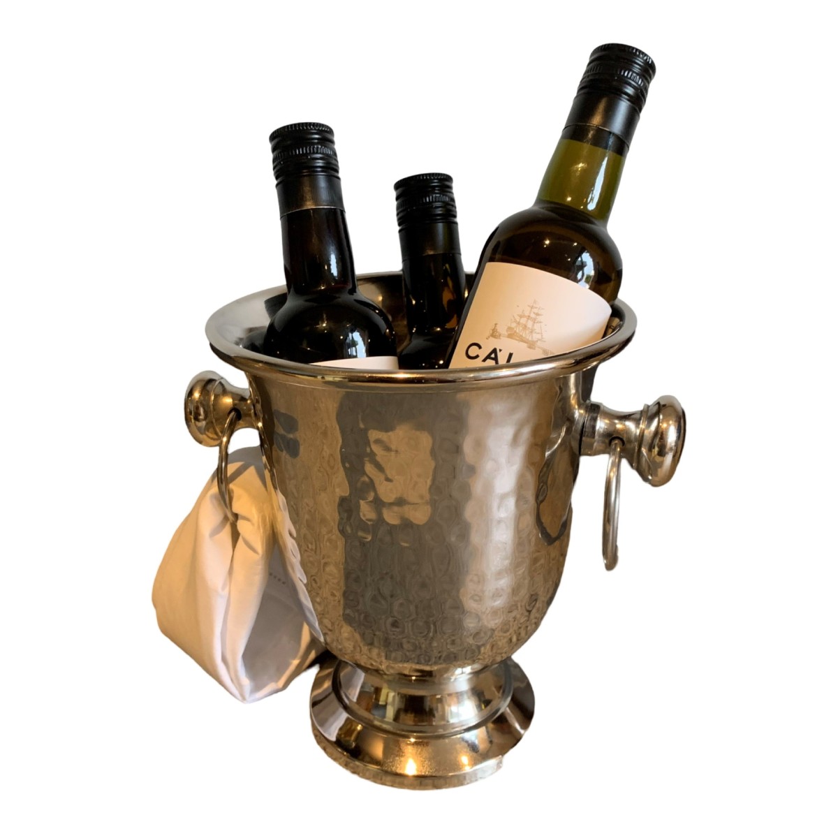Deze koeler is gemaakt van gehamerd aluminium in zilverkleur. De koeler is geschikt voor kleine flesjes wijn "halfjes" of als ijsemmertje. Het formaat: ø20cm betreft tot en met beide handgrepen (waar ringen aan zitten om stijlvol servet aan te plaatsen of de tang voor de ijsblokjes). De "bowl" of bovenzijde van de koeler heeft een formaat - bovenzijde dia 15,5 cm hg 15 cm.